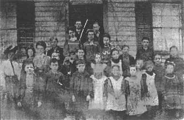 C. Yale Flanders, teacher First row (l-r): John Henry Reese, Arthur Handy, (m) unknown, (f) unknown, Beulah Reese, Bertella Reese, Marjory Handy, Etta Mosher. Second row (l-r): Lady in hat unknown, (f) unknown, (f) unknown, (m) unknown, Albert Smith, (f) unknown, (f) unknown, Eugene D. Mosher, Lulu Schuyler, Hamon Schuyler, Maud Johnson. Third row (l-r): Charles Allen, (f) unknown, (f) unknown, Hazel Reese, (Clifford) Yale Flanders, teacher, Howard Peters. |