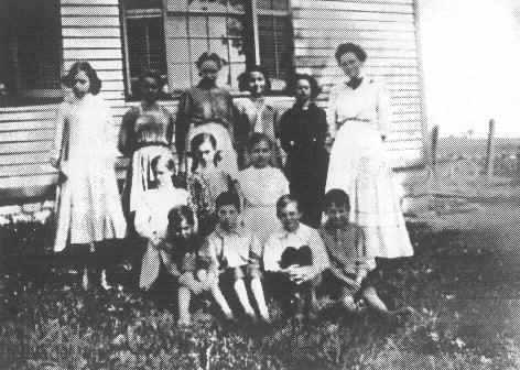 District #6 Crum Creek School - 1910 Back row (l to r): Marjorie Handy, Beulah Reese, Beulah Handy, Evadean Groff, Middle row (l to r): Esther Davis, Margaret Handy, Alta Davis. Front row (l to r): Herbert Handy, Kenneth Groff, Edward Davis, Emmett L. Mosher. Photo submitted by Emmett Mosher. |